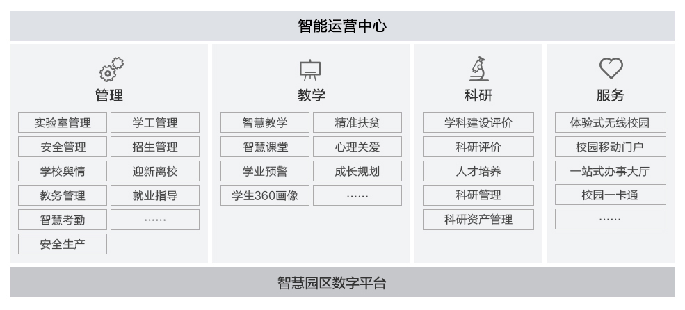 智能化智慧校園解決方案以物聯網、云計算、大數據、AI、移動互聯網等先進技術為基礎,建設智能化智慧校園,統籌建設智能化一體化教學、管理與服務平臺。賦能科研創新、提高教學質量和效率,培育優質人才。