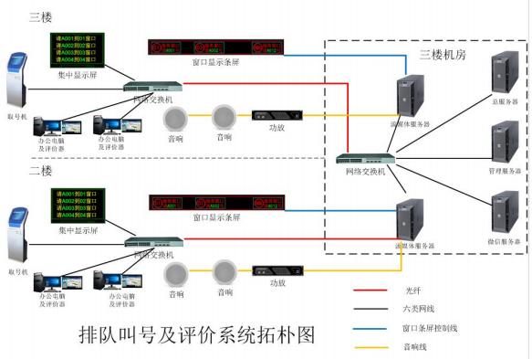 一樓、三樓辦事大廳各設(shè)置為一個叫號區(qū)域配套大屏幕電視機。一樓、三樓區(qū)域安裝取票機 1 臺,二 樓區(qū)域安裝取票機 2 臺。各配套大屏幕電視機進(jìn)行信息集中顯示,以及音響系統(tǒng)進(jìn)行語音提示。各區(qū)域根