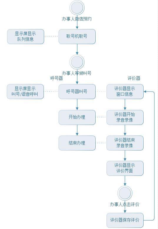 排隊叫號及服務(wù)評價系統(tǒng)工作流程圖: