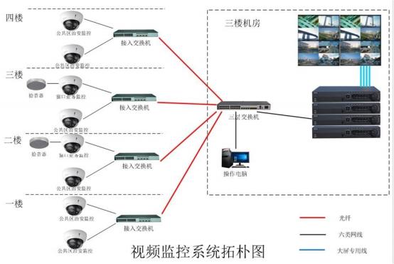嚴(yán)格遵循綜合布線標(biāo)準(zhǔn),采用六類線、光纖結(jié)合的方式; 所有前端網(wǎng)絡(luò)攝像機通過六類網(wǎng)線全部連 接到各所屬區(qū)域的接入層交換機,再通過光纖或網(wǎng)絡(luò)線連接到監(jiān)控中心的核心交換機。